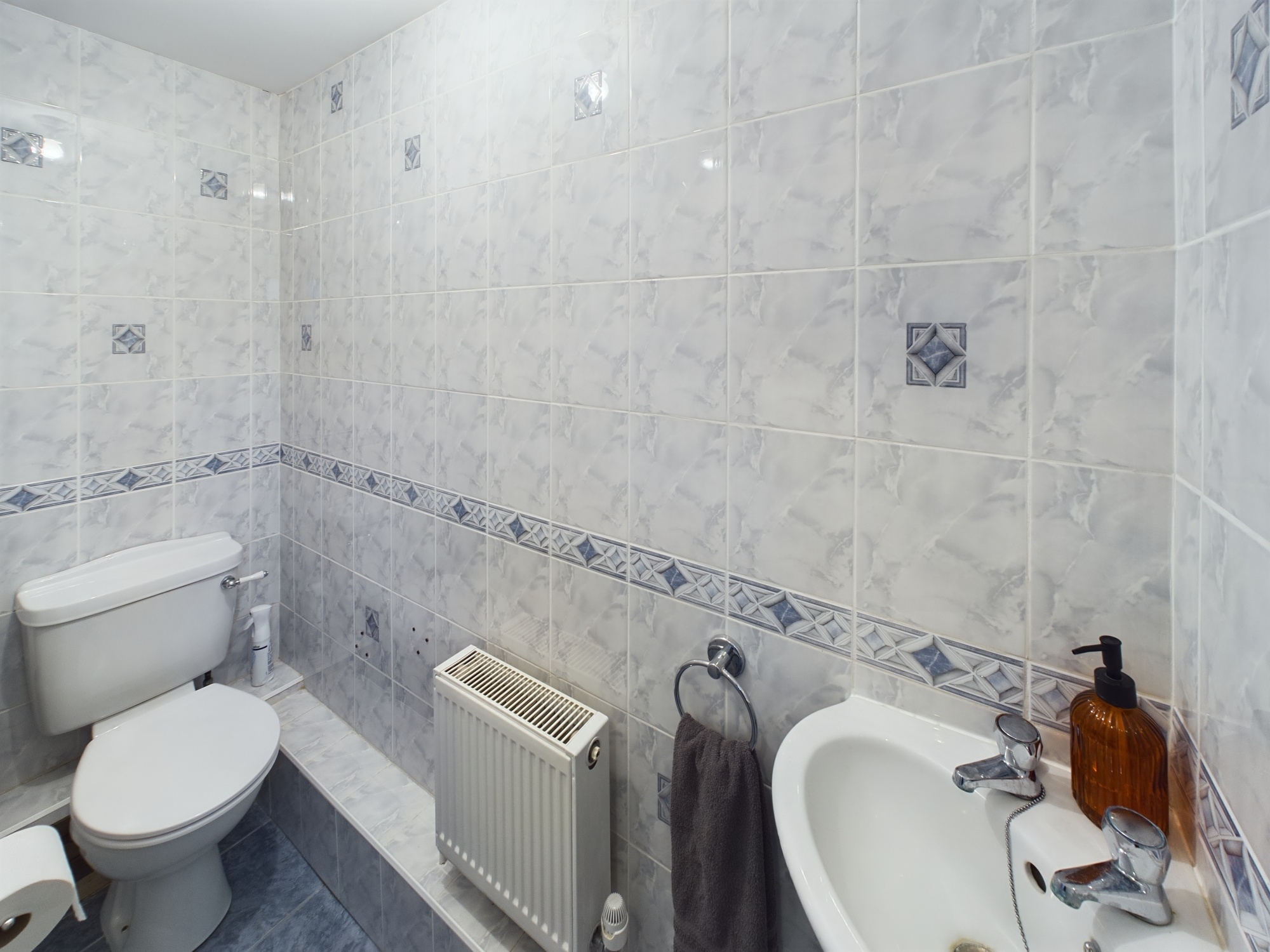 comprising close-coupled WC, corner wall mounted wash basin, radiator, tiling to walls and floor, and air extractor.