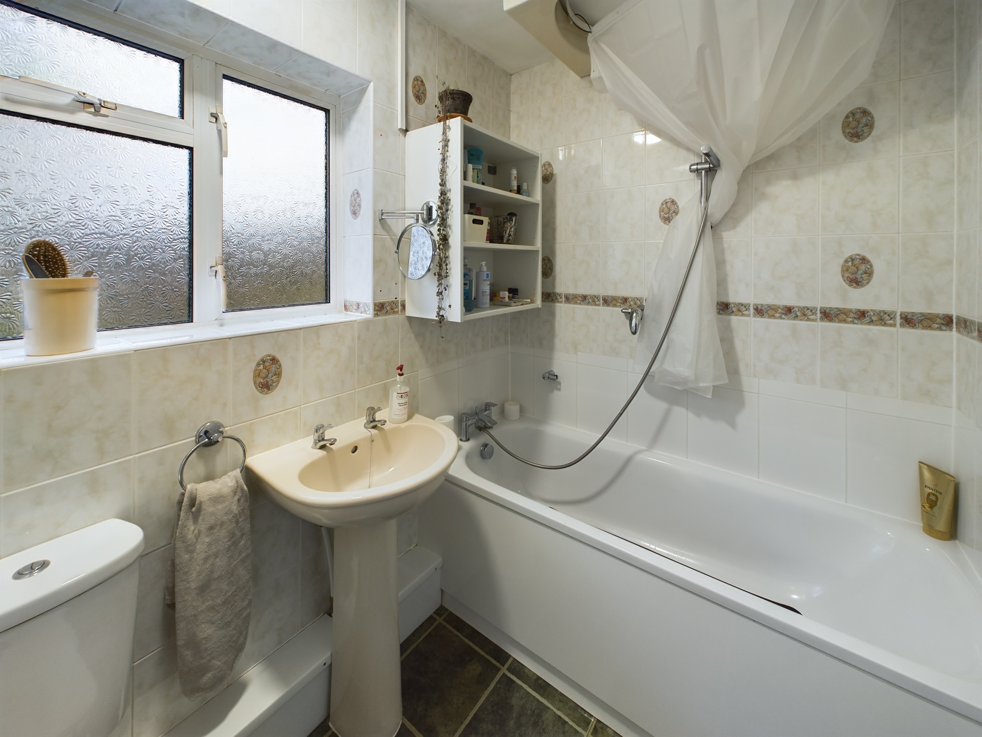 Panel enclosed bath with mixer tap & hand held shower spray, pedestal wash hand basin, close-coupled WC, radiator, tiling to walls, obscure glass window to rear.